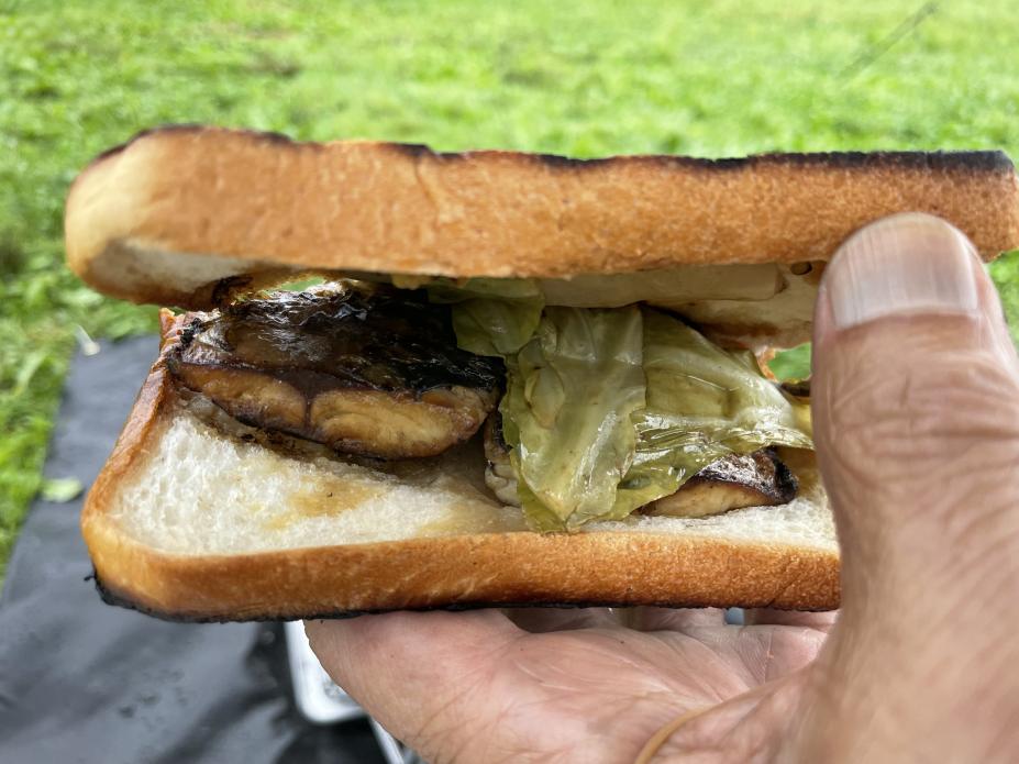 ❖人生初の「ソロキャンプ」タープ設営、バーベキュー編です! 2023.7.12~13 「ふもとっぱらキャンプ場」入場編の続きです。 今回のソロキャンプはテントは持参していません。「車中泊」で行います。 タープは、以前使っていたコールマンのスクエアータイプがあるんですが、先般開いてみたら縫い目のシールテープが剥がれていて、手直しが必要なため、断念。 今回は、洗濯物干しに使用していた「防水シート」を持参してきました。 2.8x2.8m で そこそこ使えそうかなということで、いざ展張します。 家で予行練習し、順番も決めて展張します。 この日のために、ロープ、ペグ、ポール、ハンマーなども追加購入し準備を進めてきました。 最初に、タープの位置を決めそこから四方にペグ位置を決め、打ち込んでいきます。 地面は、濡れていることもあり柔らかめですが、たまに石が当たり、打ち直す場面もありましたが、タープ展張終了。 そして、愛車デリカD5をタープ付近までバックから入れ、焚火台など小道具をセットし、小一時間かかり本日の設営完了いたしました。 時計を見ると、13時前、やっと「お昼」にします。 本日は、定番の焼きそばを作ります。ダイソーで買った「フイルム鉄板?」 の初めての使用です。心配していましたが、汁物はこぼれますが難なく使えます。 美味しくいただきました。 富士山も真正面に見え、雄大に構えていらっしゃいます。いい眺めです。ひと時を過ごします。 設営風景は、スマホにてタイムプラス撮影しましたが、未だ編集していませんので編集出来たら掲載したいと思います。 設営終わったら暇になりましたので周辺(管理棟、洗い場、トイレなど)を散策し、場所を確認いたしました。 夕方17時を過ぎると雲行きが怪しくなります。これは雨降るかも! 急いで火をおこしバーベキューの準備をします。 野菜などの材料は自宅で下ごしらえ済で、あとは焼くだけです。 雨を想定して、焚火台をタープ内に引き込み火をおこします。 新聞紙を丸めて火をつけますが中々上手くいきません。三度目くらいで薪にも火がつき、順調です。 焚火台内で薪が炭になる頃合いを見て待望の「バーベキュー」の始まりです。 あちらこちらも煙が上がり盛り上がっています。こちらはソロで富士山を相手に・・・と、楽しむつもりが、突然のどしゃ降りに皆さん「うおさお」しています。 当方は、タープに助けられ煙交じりですが、美味しい肉(火力が強く、半分が焦げます!)を召し上がることができました。 最後に大好きな「トウモロコシ」もいただきました。美味しかったです。 反省点は、火力の問題です、炭を作るのが難しいですね。 最初から炭を持参すれば済むのですが、それではちょっと…、やはり薪から炭を作ってやるのが正当派ですよね! 次は、時間をかけて炭づくりですかね! その後も雨は止みもしますが、回復まではいきません。早々に切り上げ、食器類などの洗い物を済ませ、焚火も消して(タープの外に出して、自然消火!) 車中のベッドメイキングを行い、水で顔、頭、手足を洗い就寝致しました。 (残念ながら、本日は「シャワー室」は開放していませんでした!) 当然、このような天候につき、お星さまは拝めません!お疲れさまでした! やはり、天気予報は当てになりませんねー!おやすみなさい!!(-_-)zzz 早朝、AM5時過ぎには起きていますが、周りがまだ就寝中ですので行動を差し控えています。幸いにもこの日は夜中一回もトイレに行きませんでした。 家では、最低二回はトイレタイムなんですが、車中はちょうどよい寒さでシュラフに絡まり程よい保温で、ぐっすりとはいきませんでしたが …。 元々眠れない性分なので問題はありませんが、お昼に眠くなるのは避けたいので …。 AM7時になると、ちらほら行動されている人もいるので、起きてまずはトイレタイムです。 顔を冷たい水で洗って眠気も吹っ飛び、シャキッとなりました。 ソロキャンプ二日目の始まりです。 火をおこし、朝食の準備中にまた一雨、今回は雨に降られ続けです。 朝食は、待望の「鯖ホットサンド」です。塩鯖を金網で焼いて、ホットサンドプレートでパンに挟んで焼きます。 火力が調節できないので、金網の端で焼いていきます。 塩梅良く焼けたと思ったのですが、開けてビックリ「目一杯焦げ」ていました。 それでも焦げたパンは苦かったが、鯖は美味しかったです。 これも火力が「カギ」ですね! お湯を沸かして、お味噌汁とコーヒーをいただきました。 食器類を洗い、片付けして、タープを乾かし、撤収に入ります。 撤収時にペグを再確認したら、1本足りず慌てて周辺を探し、草の間に隠れていました。 何事も最終確認すべきでした、反省しきり!!(-_-;) お昼前に撤収し、キャンプ場を後に近くの温泉施設に行こうと思いましたが、施設の名前が思い浮かばず諦めて、富士市へ降りてきました。 道中も雨に立たれたため、本日の立ち寄り先「五竜の滝」もキャンセルいたしました。(以前