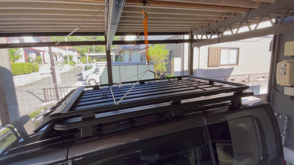 ❖デリカD5ルーフキャリア オートフラッグスBUSTERS 2080/HD改 設置 2023.9.16 待望のデリカD5用ルーフキャリア:オートフラッグス「BUSTERS 2080/HD改」購入。注文してから約一か月半で受け取りできました。 人手不足のため、一人で組立実施。デリカD5の屋根に設置時には妻のお手伝いをいただき、「ホイストロープ」の力も借りて無事設置することができました。 ホイストロープ(オーエッチ工業㈱ホイストロープ:品番/JHR-1) 組立前に、「アッパーレールパイプ」に「ピッチング塗装」を実施致しました。(接触摩耗対策) 添付組立手順に基づき、順次組み立てていきますが、以前ネットでの「組立時の注意」を思い出しながらの組立です。販売店の組立ビデオは旧品のため、参考程度にしながら…。 やはり順番を入れ替えしなければならない行程がありました。 BUSTERS本体に横のサポートバーを組み、締めこむ前に「フットアウター」を取り付けないと、「スライドロックプレート」が上手く入りませんのでご注意を! それ以外は手順どおりでOKです! デリカD5天井の「フットベースの組立」ですが、注意点が一点! 「BUSTERS本体」が乗っかるため 「取付位置」 に ご注意です! 最終的に「BUSTERS本体」をフットベースに取り付ける際にフットベースの取付ボルト穴が合わず、2回「BUSTERS本体」を上げ・下げし「微調整」いたしました。 最終工程、デリカD5への設置です。 「ホイストロープ」 を使い、妻にお手伝いいただき行いました。 事前にカーポートへ設置し「ホイストロープ」で 「吊り上げ」スタンバイです。 ロープを張り 「重心と傾き」 を微調整していきます。 いい塩梅に釣り合った状態で吊り上げ、その下に 「デリカD5を移動」 して合体です。 合わせ時再度 「フットプレートの位置」 を 微調整 し、無事「設置完了」です! お疲れ様でした!